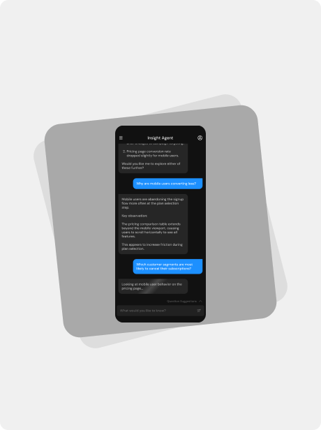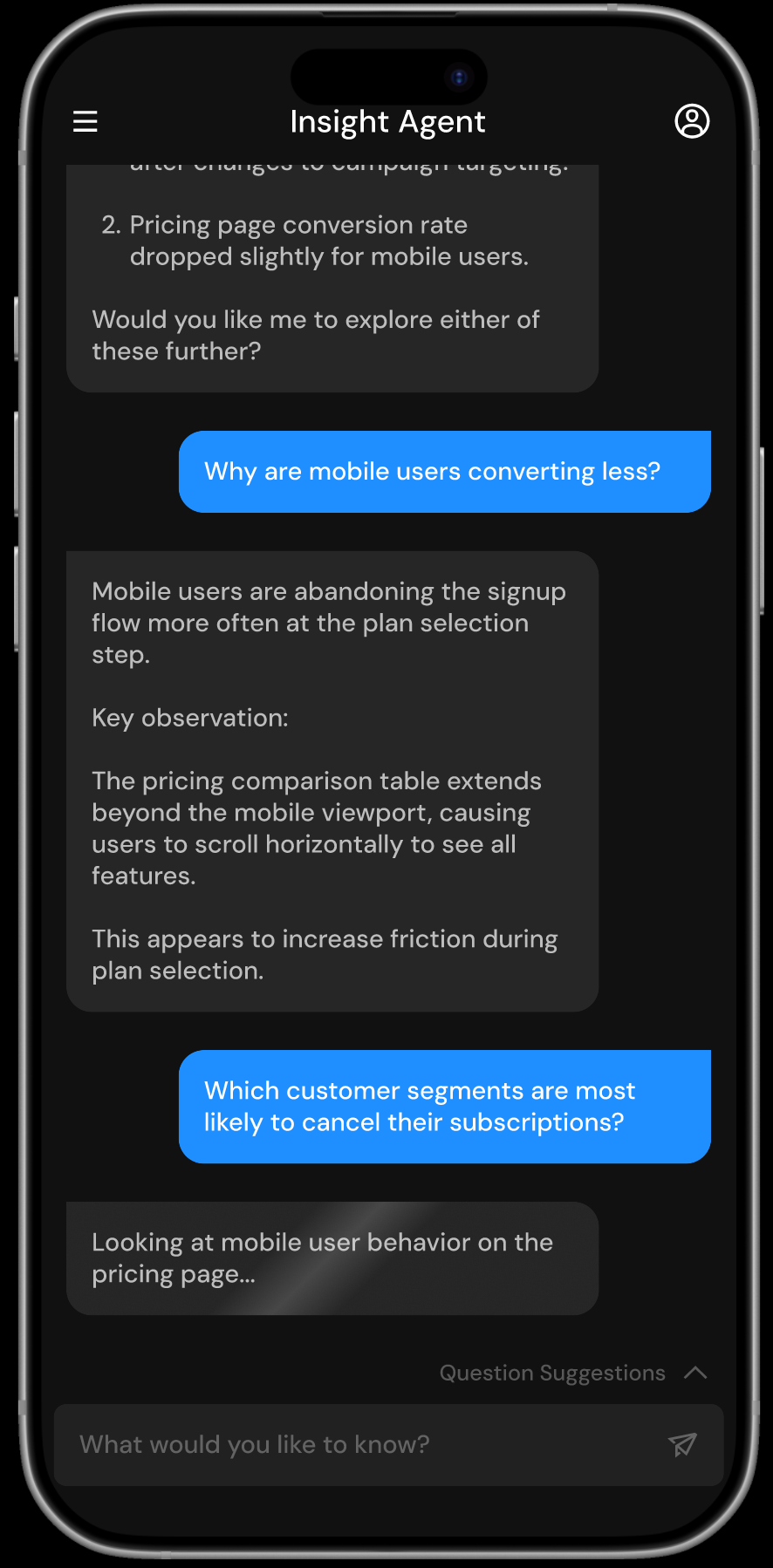 Suggested follow-up questions help guide the conversation and encourage deeper exploration, while the interface communicates what the agent is analyzing in real time to build trust in the system’s reasoning.