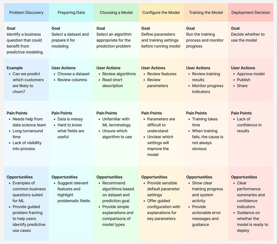 I created a journey map to understand how users move from defining a business problem through training and evaluating a machine learning model. Mapping goals, actions, pain points, and opportunities at each stage helped reveal where the experience needed clearer guidance and support.