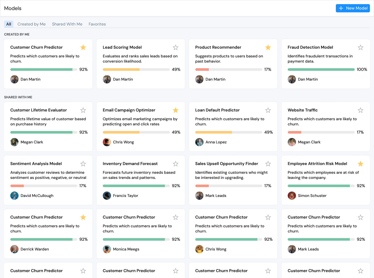 The landing page provides a central place where users can view, manage, and create machine learning models. From here, users can quickly see the status of their work and explore models created by others in the organization.