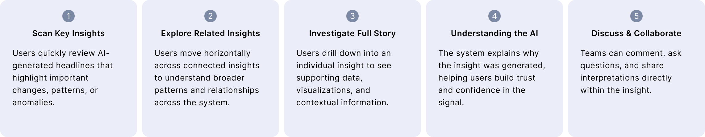 Structuring the experience around concise insights with clear exploration paths helps reduce cognitive overload and enables business users to move from awareness to understanding without needing deep analytical expertise.