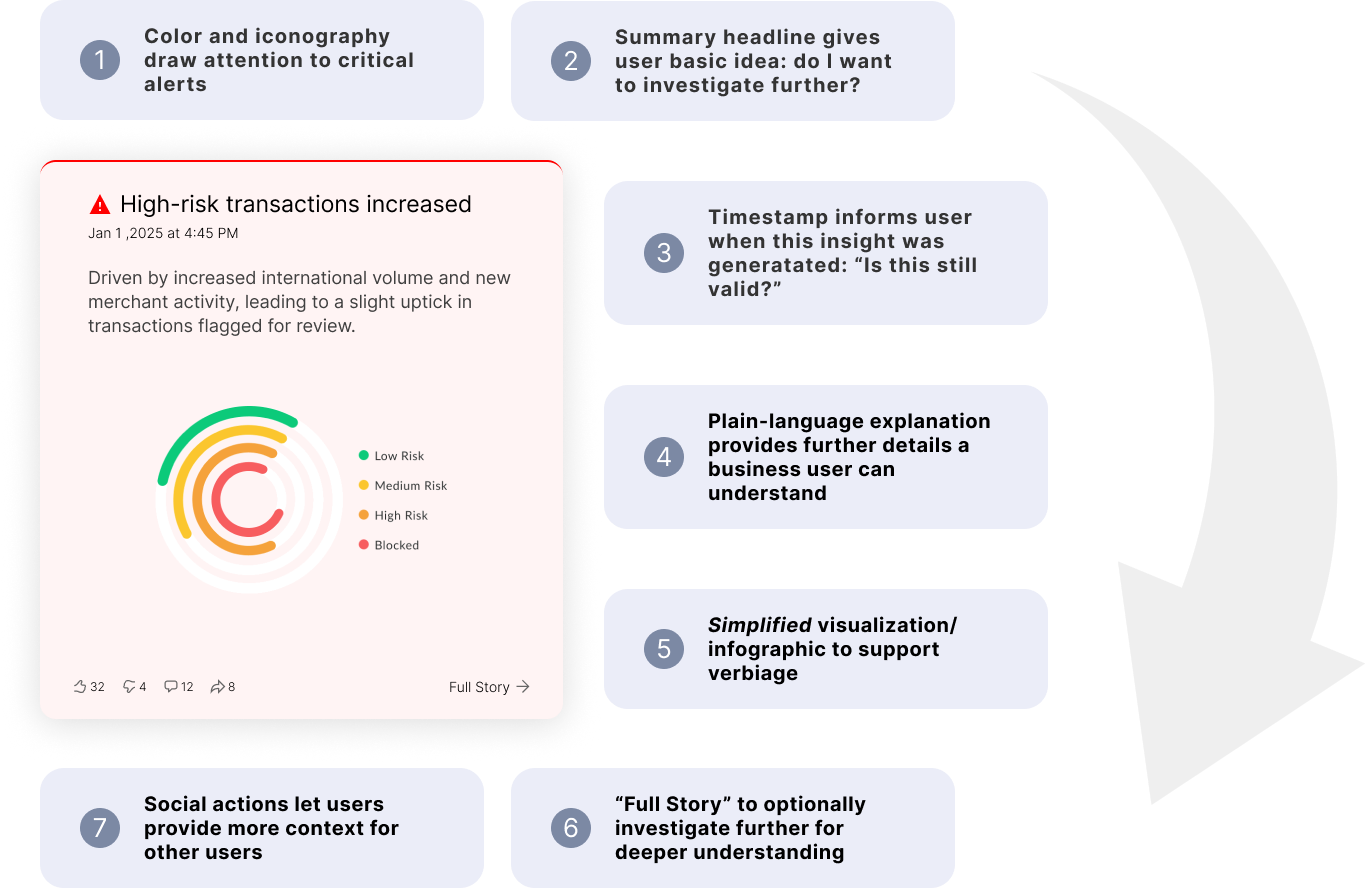 Visual cues and color immediately draw attention to important signals, while a concise headline communicates the core insight at a glance. A timestamp establishes relevance, and a plain-language explanation provides additional clarity without requiring technical expertise. A simplified visualization reinforces the message visually, making patterns easier to grasp. If users want to learn more, the “Full Story” pathway allows them to drill into supporting data, related visualizations and insights, AI reasoning (for trust), and discussion.