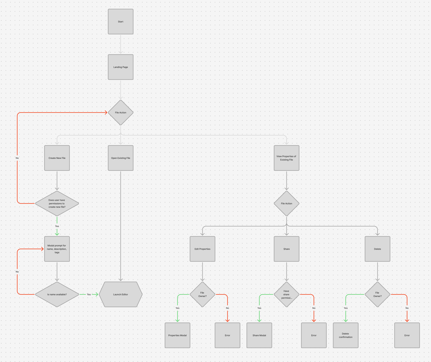 This user flow maps the primary entry paths into the product, from initial launch through file creation, management, and editing. It demonstrates how the system adapts to user intent and permissions, balancing fast access to core workflows with guardrails around high-impact actions like sharing and deletion.